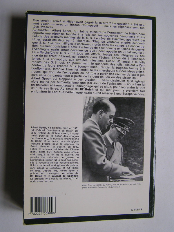 Albert Speer a indiscutablement été un proche de Hitler,. Il en fit son ministre de l'armement avec la haute main sur tous les pans de l'économie de guerre. Fort de son expérience et des documents et archives inédites de la SS qu'il a pu étuduer, il nous dresse ce qu'aurait été l'Allemagne nazi, et par extention l'Europe nazi, si Hitler avait gagné la guerre.