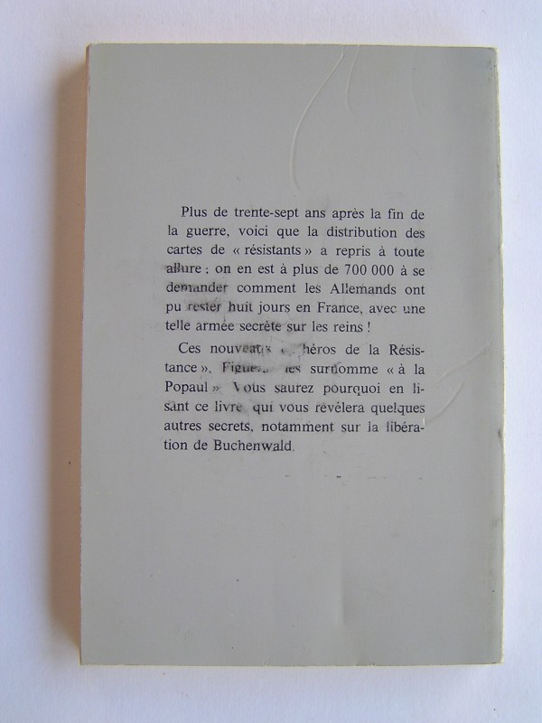 Plus de trente-sept ans après la fin de la guerre, voici que la distribution des cartes de "résistants" a repris à toute allure; on en est à plus de 700 000 a ce demander comment les Allemands ont pu rester huit jours en france, avec une telle armée secrète sur les reins! Ces nouveaux "Zhéros de la Résistance", Figuéras les surnomme "à la Popaul".