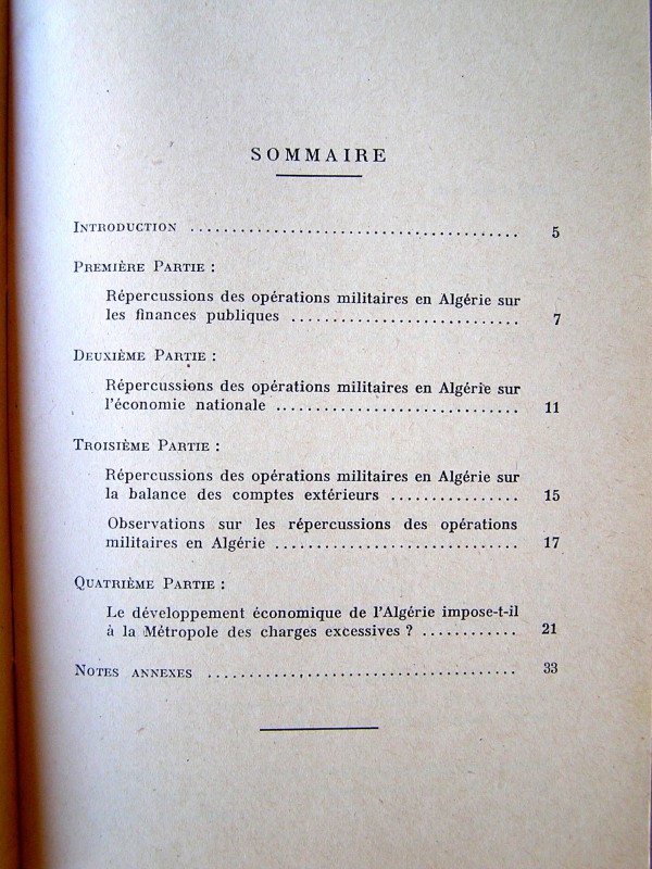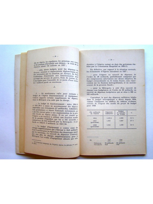 Une petite brochure rédigée par les services du minitère de l'Algérie au début de l'année 1958, à une période où la question de la guerre en Algérie commence à agiter les composantes politiques de la IVe république finissante. Cette brochure traite, très objectivement, du poids (défini comme supportable) des opérations militaires et des mesures de dévelloppement sur le budget global de la France.