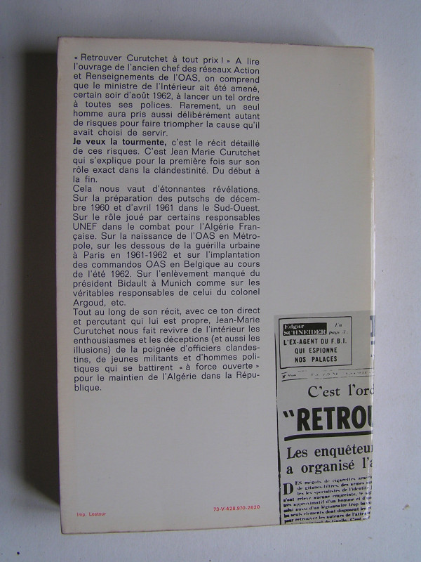 "Retrouver Curutchet à tout prix!" A lire l'ouvrage de l'ancien chef des réseaux Action et renseignements de l'O.A.S., on comprend que le ministre de l'Intérieur ait été amené, certain soir d'août 1962, à lancer un tel ordre à toutes les polices. Rarement un seul homme aura pris aussi délibérément autant de risques pour faire triompher la cause qu'il avait choisi de servir.