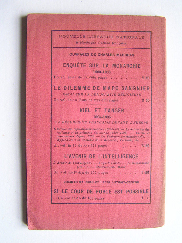 Petit ouvrage paru en 1911 alors que Maurras a déjà conquis une large part de son public et que le journal "L'action française" est, sinon largement diffusée dans les milieux populaires, surtout lu avec attention dans les milieux intellectuels et politiques.