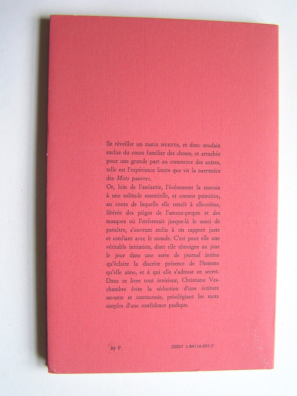 "Se réveiller un matin muette, et donc soudain exclue du cours famillier des choses, et arrachée pour une grande part au commerce des autres, telle est l'expérience limite que vit la narratrice des Mots pauvres... C'est pour elle une véritable initiation dont elle témoigne au jour le jour dans une sorte de journal intime."