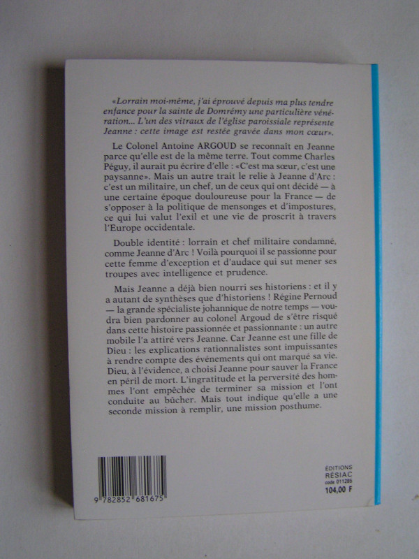 Le colonel Argoud revient dans ce petit ouvrage sur la vie et l'épopée de Jeanne d'Arc. Il nous conte son histoire non seulement comme un historien scrupuleux qui s'est abreuvé aux meilleurs sources, mais aussi comme un compatrote animé des mêmes convictions religieuses. Il souligne la part divine de sa réussite mais aussi l'ingratitude humaine qui l'a empèchée de terminer sa mission.