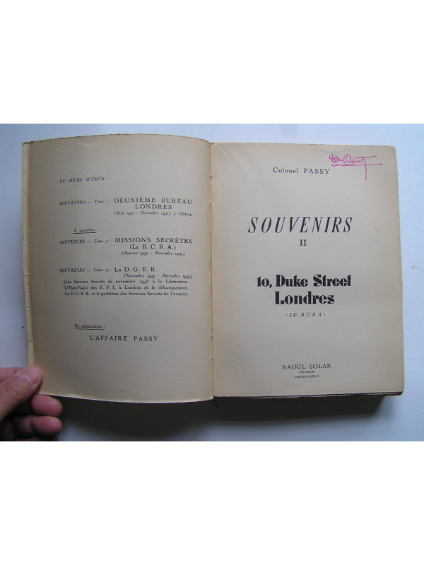 Les deux premiers tomes des mémoires de guerre du Colonel Passy, chef du BCRA (Services secrets de la France Libre):