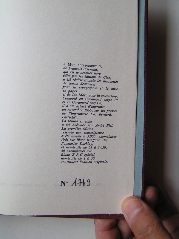 Exemplaire de la première édition, justifié, avec envoi de l'auteur. Le grand roman, qui n'en est pas un, de l'Après-Guerre, de la réinsertion difficile des exclus de l'Epuration, de la conquête d'une place au soleil sans renier un idéal et de la résurgence, encore bien timide, de la droite nationale jusqu'à l'exécution du colonel Bastien-Thiry "le dernier mort de mon Après-Guerre".