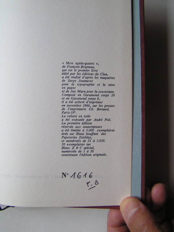 Exemplaire de la première édition, justifié, avec envoi de l'auteur. Le grand roman, qui n'en est pas un, de l'Après-Guerre, de la réinsertion difficile des exclus de l'Epuration, de la conquête d'une place au soleil sans renier un idéal et de la résurgence, encore bien timide, de la droite nationale jusqu'à l'exécution du colonel Bastien-Thiry "le dernier mort de mon Après-Guerre".