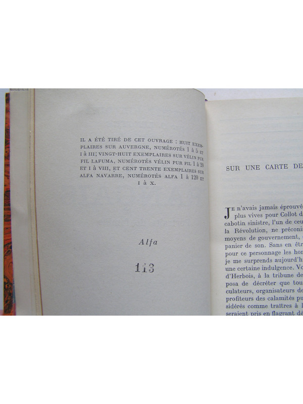 Un des 130 exemplaires de l'édition originale sur Alfa Navarre numérotés (N°113) établie dans une agréable reliure signée C. Ruban relieur Villefranche en demi-chagrin rouge (premier plat de couv conservé), dos à 4 nerfs avec pièces de titre et auteur en cuir noir et ornements dorés, tranche de tête dorée en bon état (mors du premier plat fendu et recollé sur 5 cm en coiffe de tête et coins légèrement frottés). Intérieur en très bon état presque parfait.