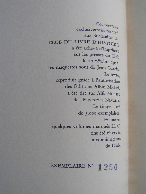Tirage de 3000 exemplaires numérotés sur Alfa Mousse Navarre (n°1250) pour le Club du Livre d'Histoire dans une relire demi-cuir éditeur.