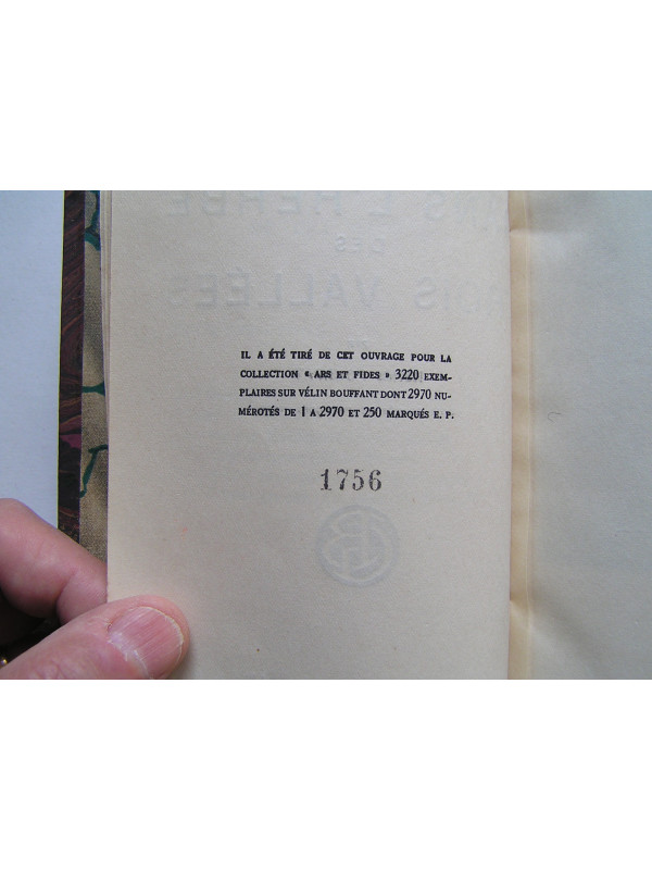 Edition de 1927 (année de la première édition), un des 3220 exemplaires numérotés sur vélin bouffant (n°1756) tirés pour la collection "Ars et Fides", établi dans une reliure demi-cuir à gros grain long maron foncé, dos à quatre nerfs avec pavés titre-auteur or en cuir rouge, en bon état (franges des plats un peu frottées). intérieur bien propre (Tranche de tête légèrement salie et pages légèrement jaunies).