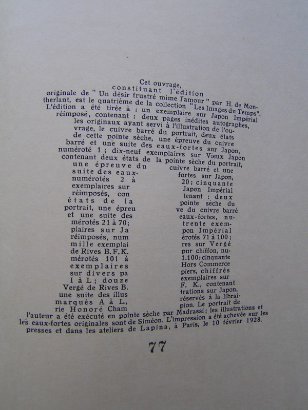 Edition originale, quatrième de la collection " Les images du temps" des éditions Lapina, un des 30 exemplaires sur Japon Impérial réimposés (après 70 avec suites) numérotés (n°77/100) et avant 1000 exempalires sur vergé de Rives.