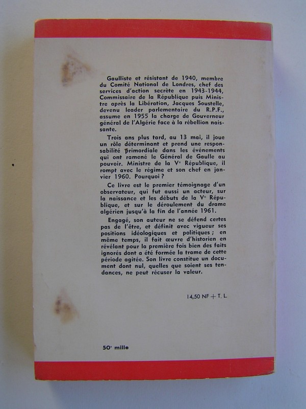 Au 13 mai, Jacques Soustelle joue un rôle déterminant et prends une responsabilité primordiale dans les événements qui ont ramené le général De Gaulle au pouvoir. Ce livre est le premier témoignage d'un observateur, qui fut aussi un acteur, sur le déroulement du drame algérien jusqu'à la fin de l'année 1961.