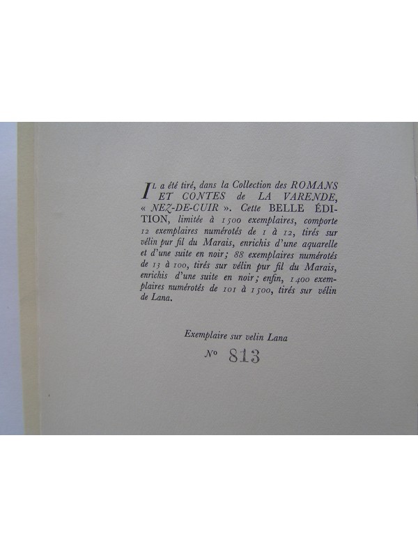 Belle édition (vers 1950) sur vélin de Lana (limitée à 1500 exemplaires), numérotée (n°813), joliement illustrée par Paul Jarach avec de belles aquarelles en compositions dans le texte. Exemplaire en très état en dehors de qqes plis de lecture au dos et de très légers au pied du premier plat de couv (coin de tête du premier plat très légèrement corné). On y joint un avis des éditeurs.