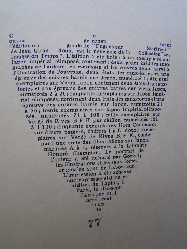 Edition originale, neuvième de la collection " Les images du temps" des éditions Lapina, un des 30 exemplaires sur Japon Impérial réimposés (après 70 avec suites) numérotés (n°77/100) et avant 1000 exempalires sur vergé de Rives.