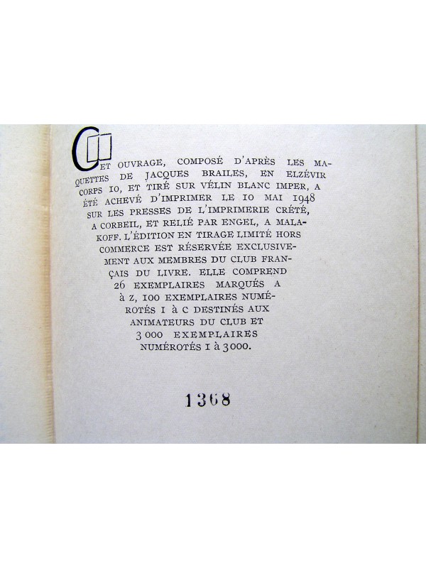 | Divers | Un des 3000 exemplaires numérotés sur vélin blanc Imper réservés aux membre du Club (n°1368). cartonnage très légèrement fané. |