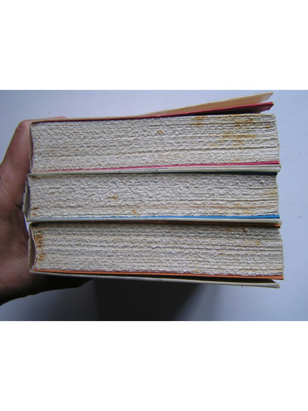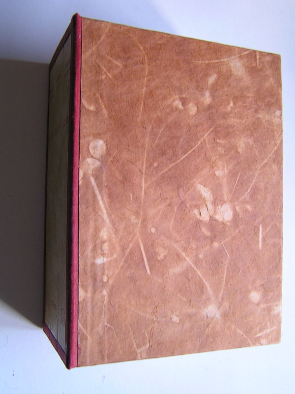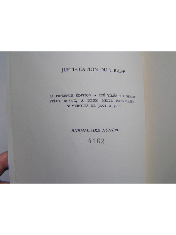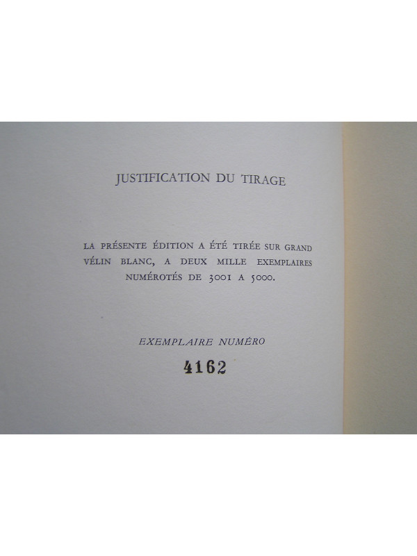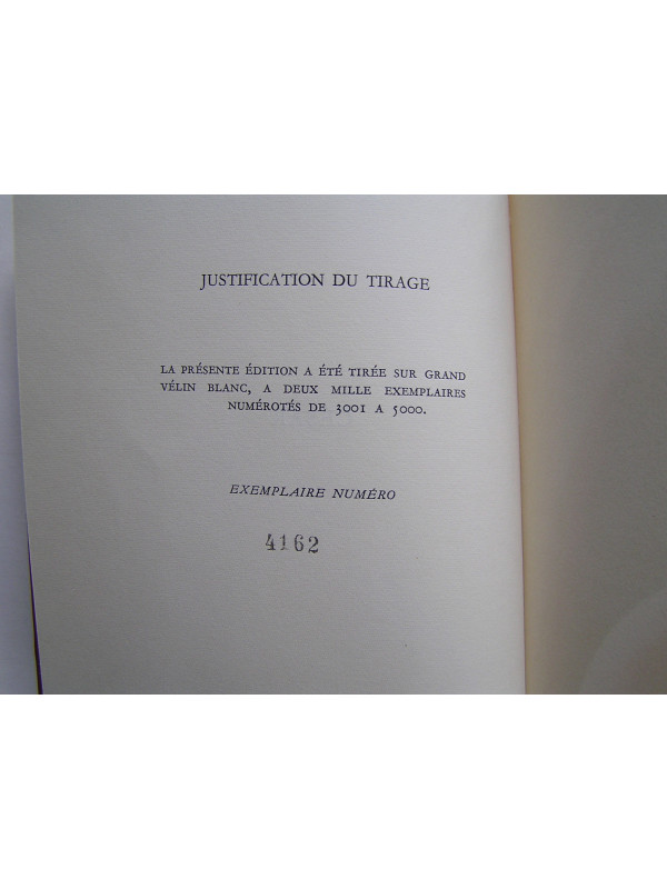 Edition de 1949 des trois pièces brochées sous couv rempliées et sous double emboîtage (emboîtage refait autour de celui d'origine) imprimées sur Grand Velin Blanc et tirées à 2000 exemplaires numérotés de 3001 à 5000 (N°4162) en bon état (les dos sont légèrement arrondis avec de légers plis de lecture. Les coiffes et les coins sont légèrement frottés. Quelques pâles rousseurs sur les tranches de tête. Les intérieurs sont bien propres.).