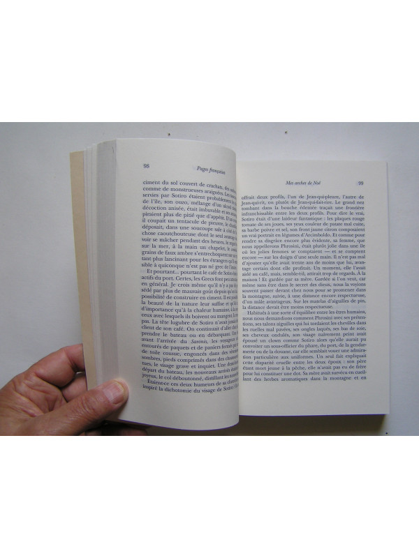 "Comme dans pages grecques, Pages française reprend deux livres traitant plus directement de ce que je dois à la France: une langue, un trésor littéraire, une certaine tournure d'esprit et des amitiés que le temps et la distance n'ont jamais pu effacer. A ces deux livres (Mes arches de Noé" et Bagages pour Vancouver), j'ai ajouté un "post-scriptum" bien daté pour qu'on ne se méprenne pas.