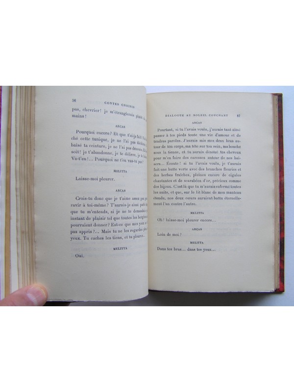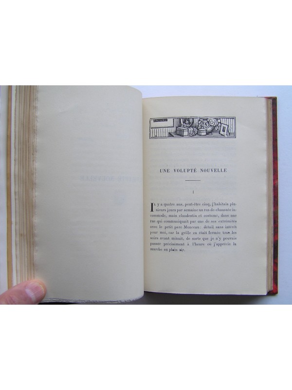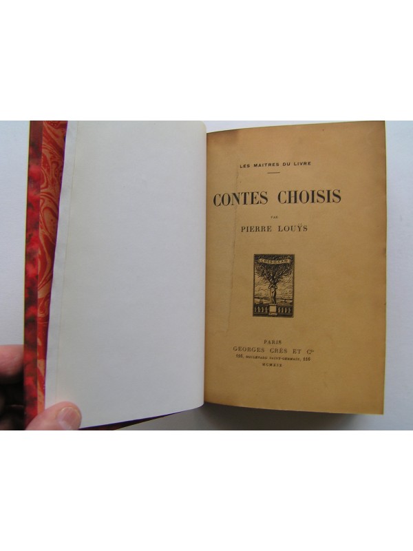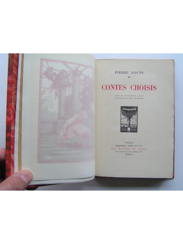 Dans la collection "Les maîtres du livre" des éditions Georges Crès et Cie, un des exemplaires imprimés sur papier de Rives (n°921) établi dans une agréable reliure signée (R. Marsillach à Toulouse) en demi-chagrin rouge (premier plat de couv conservé), dos à quatre nerfs, en bon état (légère insolation du dos et léger frottement des mors. Intérieur bien propre (tranche de tête légèrement salie).