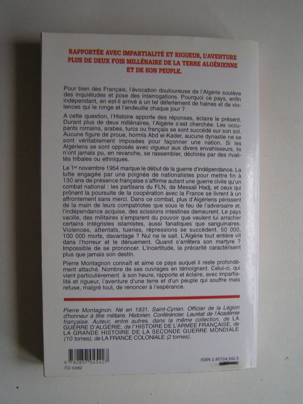 Pour bien des Français, l'évocation douloureuse de l'Algérie soulève des inquiétudes et pose des interrogations. Pourquoi ce pays, enfin indépendant, en est-il arrivé à un tel déferlement de haines et de violences qui le ronge et l'endeuille chaque jour? A cette question, l'histoire apporte des réponses, éclaire le présent. Durant deux millénaires l'Algérie s'est cherchée.