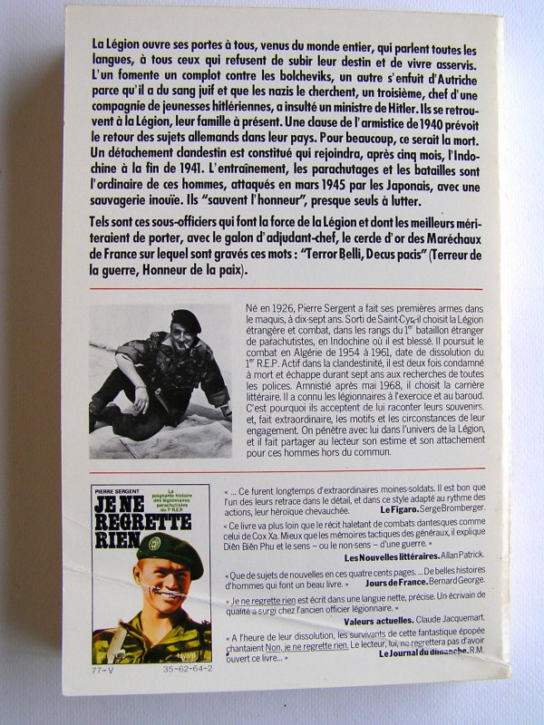 Un livre sur l'épopée du 5e Etranger en Indochine pendant et à la suite de l'attaque japonaise et surtout un récit à la gloire des sous-officiers de la Légion étrangère qui, de tous temps et spécialement pendant les conflits, font la force de la Légion et dont les meilleurs mériteraient de porter, avec le galon d'adjudant-chef, le cercle d'or des Maréchaux de France sur lequel sont gravés ces mots: "Terror belli, Decus pacis" (Terreur de la guerre, Honneur de la paix).