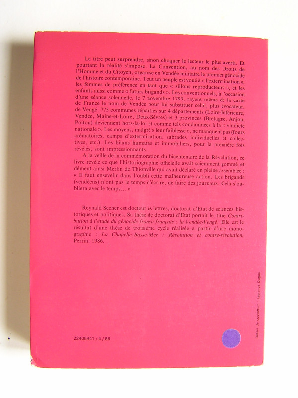 Première édition de 1986 d'un livre important, voire capital, pour comprendre la chape de plomb qui pèse encore sur une large partie de notre Histoire nationale. En dehors de toute idéologie, il révèle ce que l'historiographie officielle gomme encore et dément sur le rôle de la Convention dans les massacres en Vendée. Cet ouvrage a d'ailleurs valu, à son auteur, des percécutions sans nombre dans le millieu très fermé de l'Université.