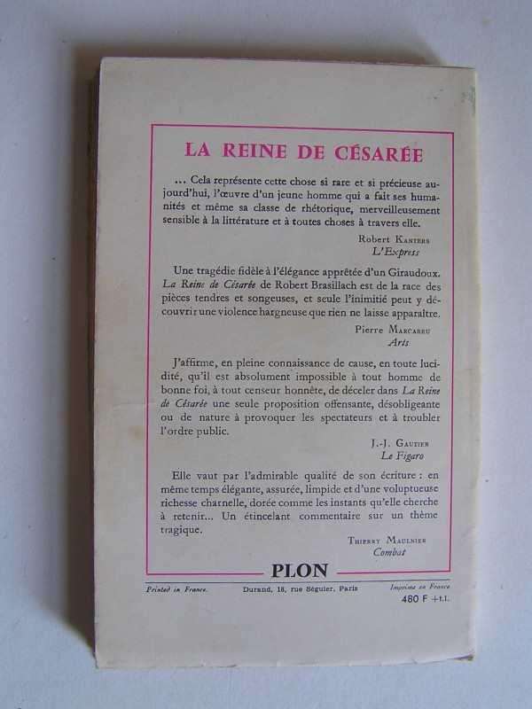 Tragédie en cinq actes, publiée initialement en 1954 sous le titre donné par Robert Brasillach, "Bérénice" et réédité en 1957 par Plon dans la version scénique représentée pour la première fois au publicle 26 juillet 1957. Elle fit scandale lors de sa première représentation parce que Brasillach devait rester dans l'oubli le plus profond.