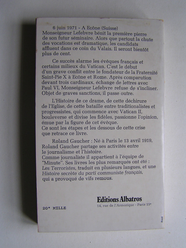 C'est le début d'un grave conflit entre le fondateur de la Fraternité Saint-Pie X à Ecône et Rome. l'histoire de ce drame, de cette déchirure de l'Eglise, de cette bataille entre traditionalistes et progressistes, qui commence avec vatican II, bouleverse et divise les fidèles, passionne l'opinion, émue par la figure de cet évêque. Un page de notre histoire qui n'est pas encore fermée.